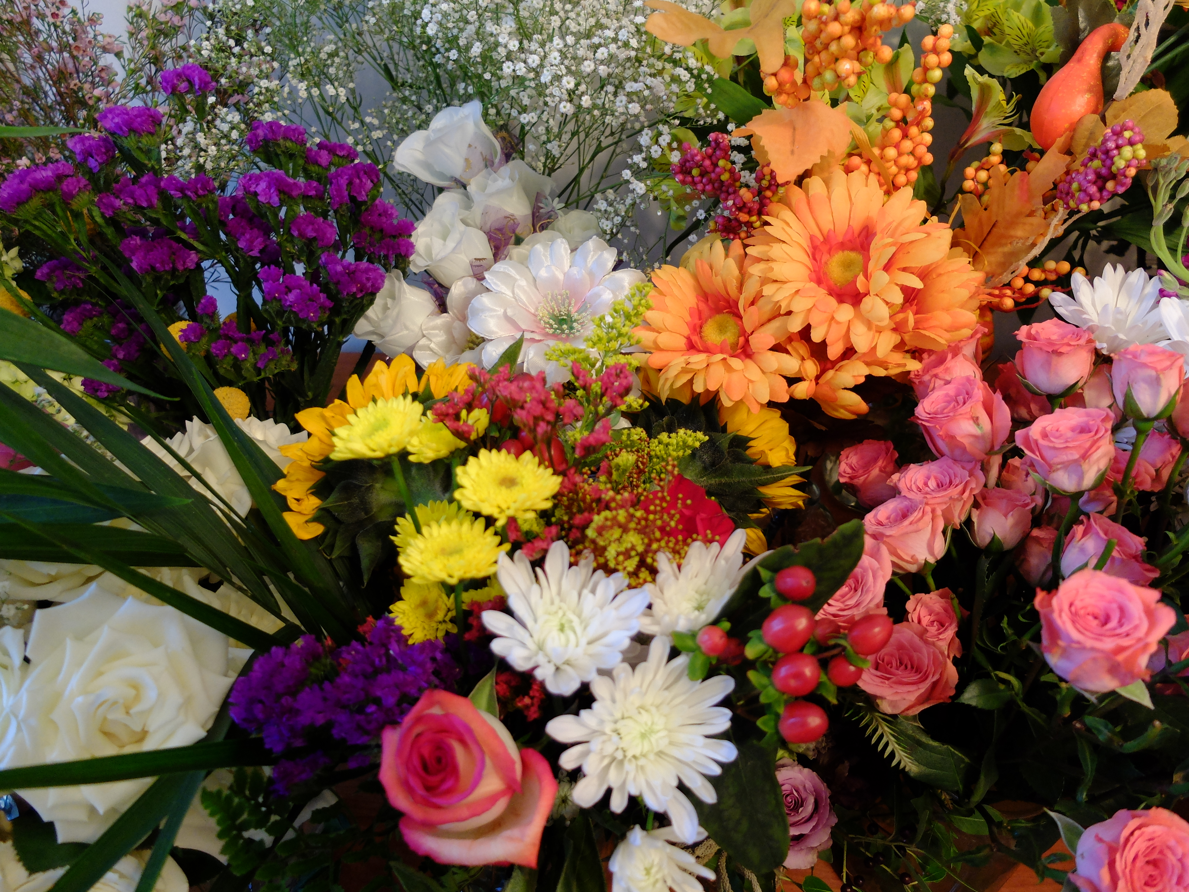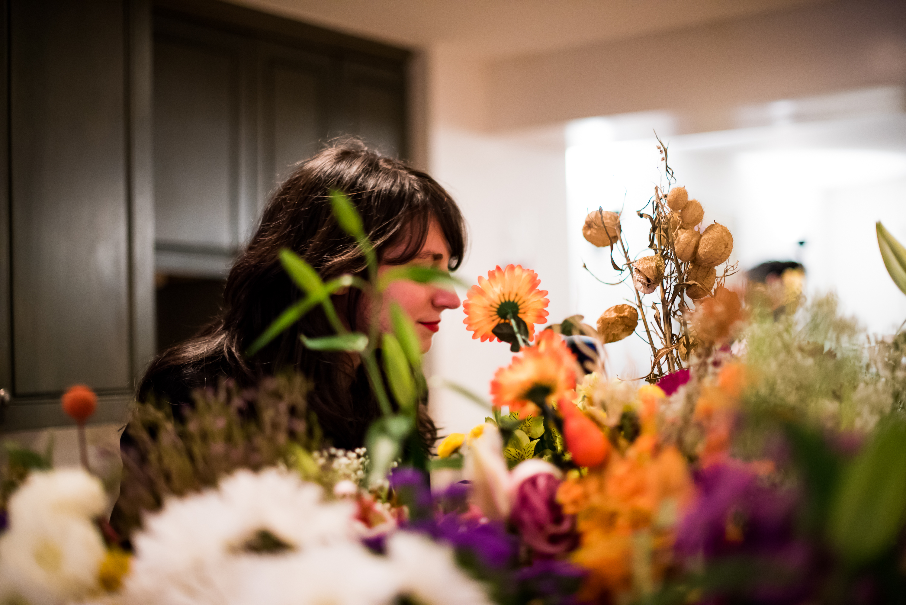 A visitor enters for his portion of the performance with a bouquet of sunflowers for Carolyn.