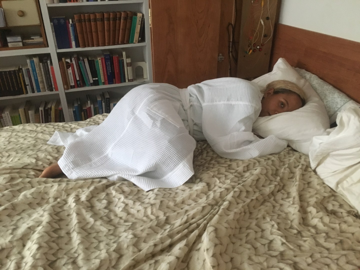 For their residency here, which paralleled another by Canaries, a collective of which they are part, at Recess, an art space in a storefront in Soho, Carolyn wanted to highlight the specifically domestic and inevitably intimate nature of Room & Board. They also wanted to put together a work that would not only serve as a conduit for heir ideas about illness and wellness, but that might actually serve as a structure for fulfilling their physical and emotional needs. Over their residency, we developed Support System: for Tina, Park, and Bob, a durational performance for one viewer at a time. The work would have 24 viewers, each of whom would sign up in advance for a 30-minute performance time. On Sunday, October 30, Carolyn would stay in bed all day, from 9 a.m. to 9 p.m., receiving these visitors in succession. Part of the idea was to create a performance work that would allow Carolyn to rest: a marathon of comfort instead of the extreme asceticism fetishized by the art world (think of Marina Abramović’s 2010 The Artist is Present at MoMA).