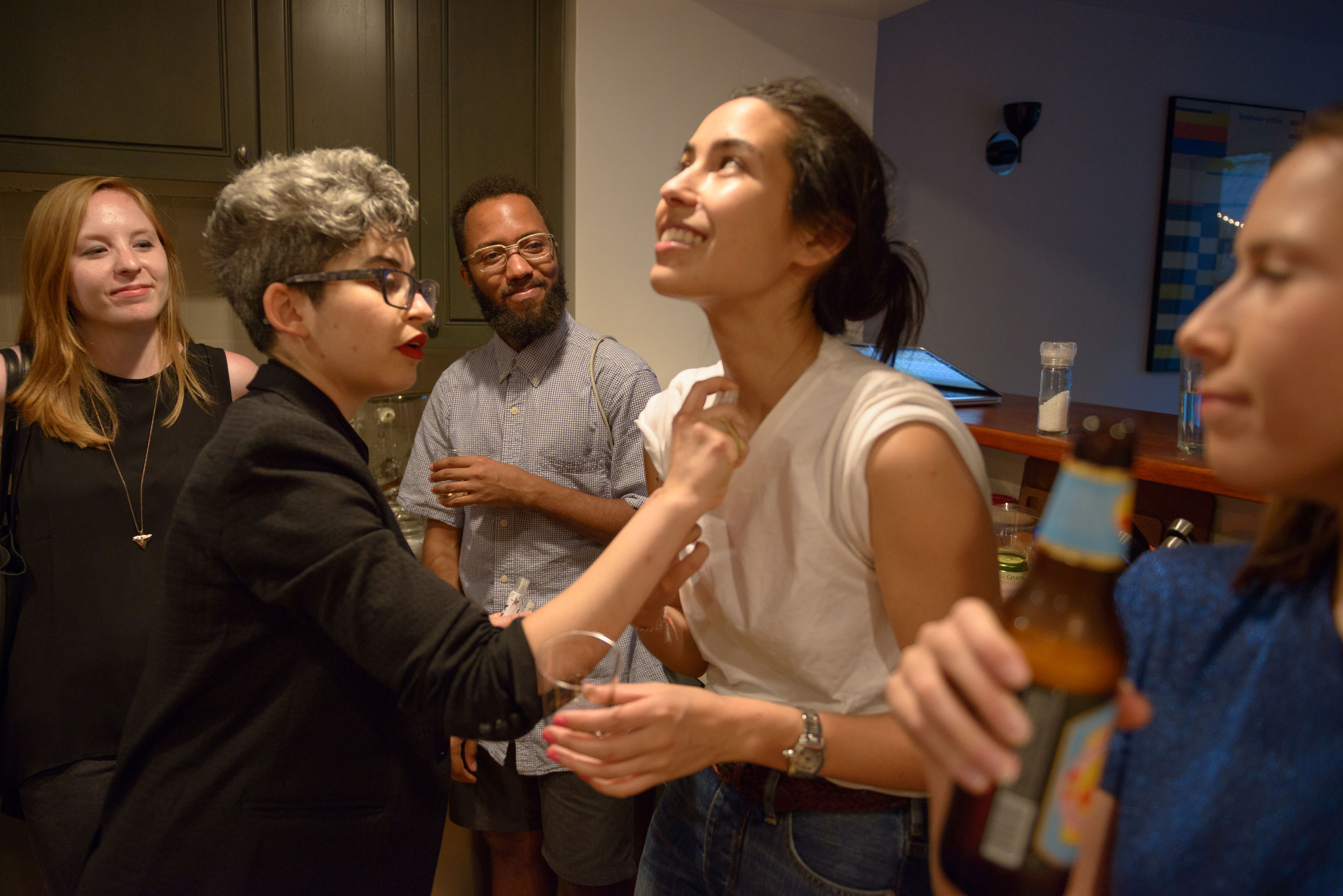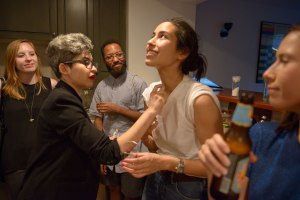 Director Julia Pelta Feldman sprays a guest with synthetic human pheromones.